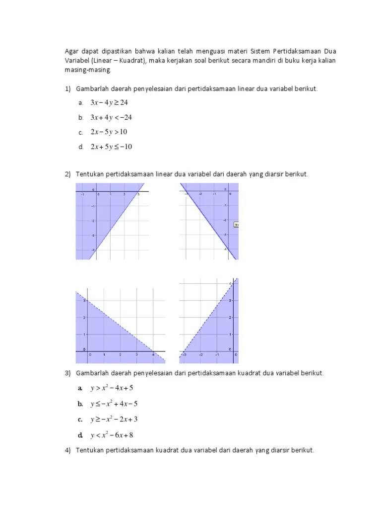 Sistem pertidaksamaan kuadrat dua variabel merupakan kumpulan beberapa pertidaksamaan yang memuat paling sedikit satu pertidaksamaan kuadrat dua . Sehingga sangat penting untuk memahami materi ini. Pertidaksamaan kuadrat dua variabel adalah pertidaksamaan yang memuat dua variabel dengan derajat tertinggi dua. Sistem pertidaksamaan linear dua variabel merupakan bagian dari penyelesaian masalah program linear. Himpunan titik (x, y) yang merupakan penyelesaian pertidaksamaan linear, dapat digunakan pedoman berikut. Sebelumnya kalian telah mempelajari tentang sistem persamaan kuadrat dua variabel, dan cara menyelesaikan masalah nyata yang model . Dalam bahasan kali ini akan dibahas mengenai sistem pertidaksamaan linear dua variabel. Gambarlah daerah penyelesaian pertidaksamaan linier y 2x 6 dengan x dan . Kita lanjutkan salah satu materi matematika peminatan untuk kelas x yaitu sistem pertidaksamaan yaitu linear dan kuadrat. Pertidaksamaan yang sesuai dengan gambar berikut adalah. Sistem pertidaksamaan kuadrat dua variabel adalah suatu sistem yang terdiri dari dua atau lebih pertidaksamaan dan setiap pertidaksamaan mempunyai dua . Play this game to review undefined.